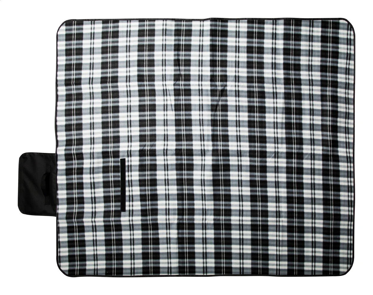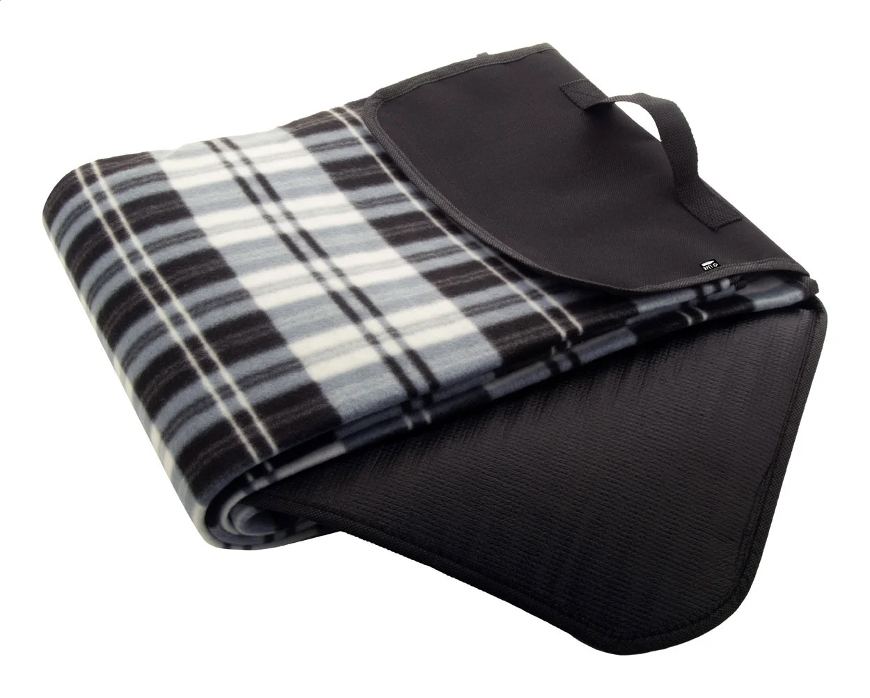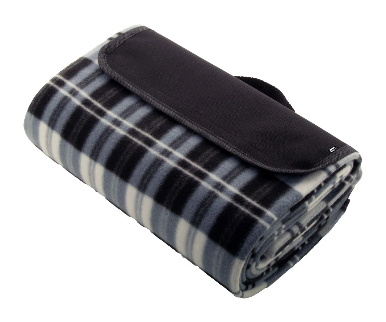 Coperta da picnic ripiegabile in pile polare RPET con maniglia e retro trattato in materiale idrorepellente.