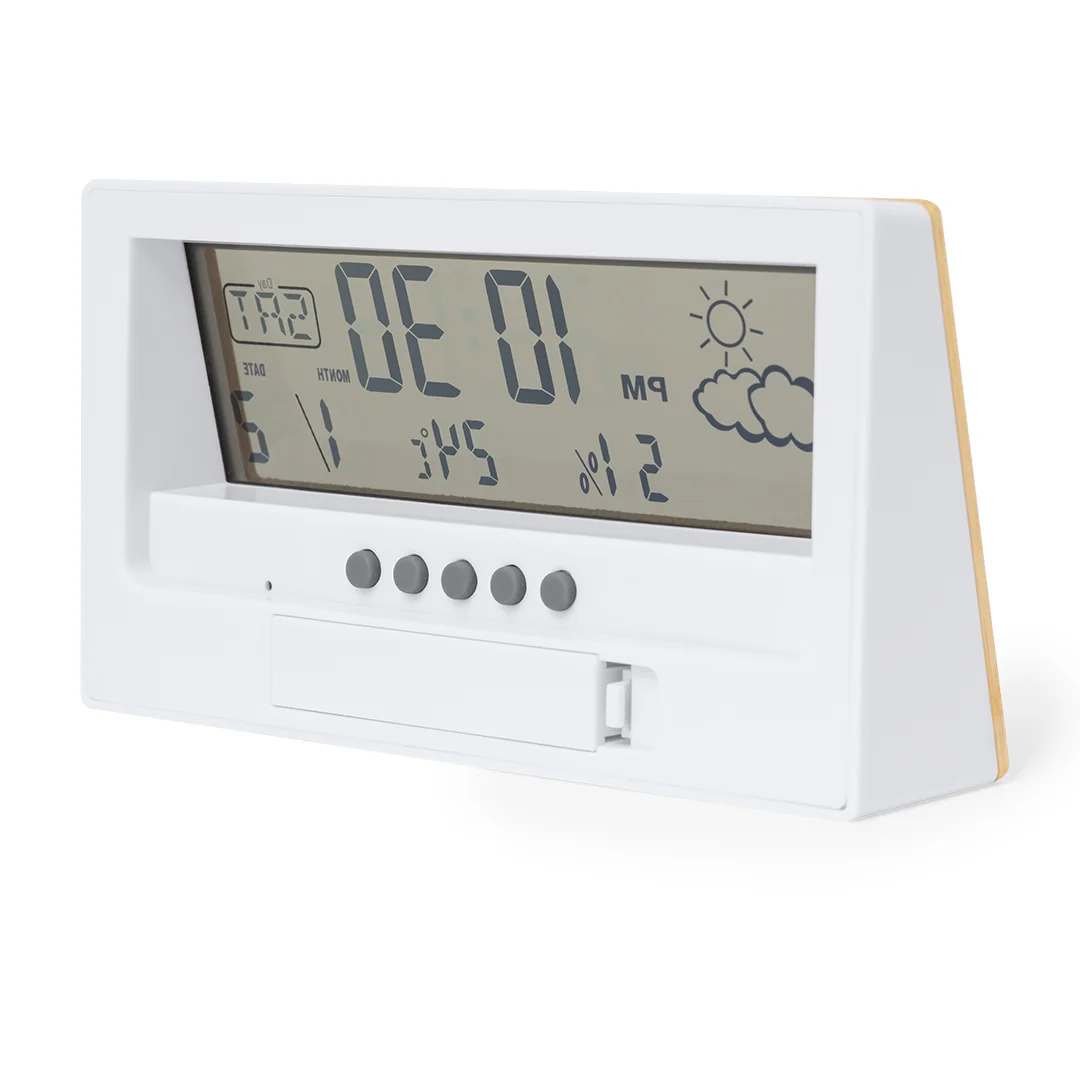 Orologio digitale e stazione meteorologica in bambù e plastica ABS, con termometro ed igrometro. Funziona con 2 batterie AAA, non fornite.