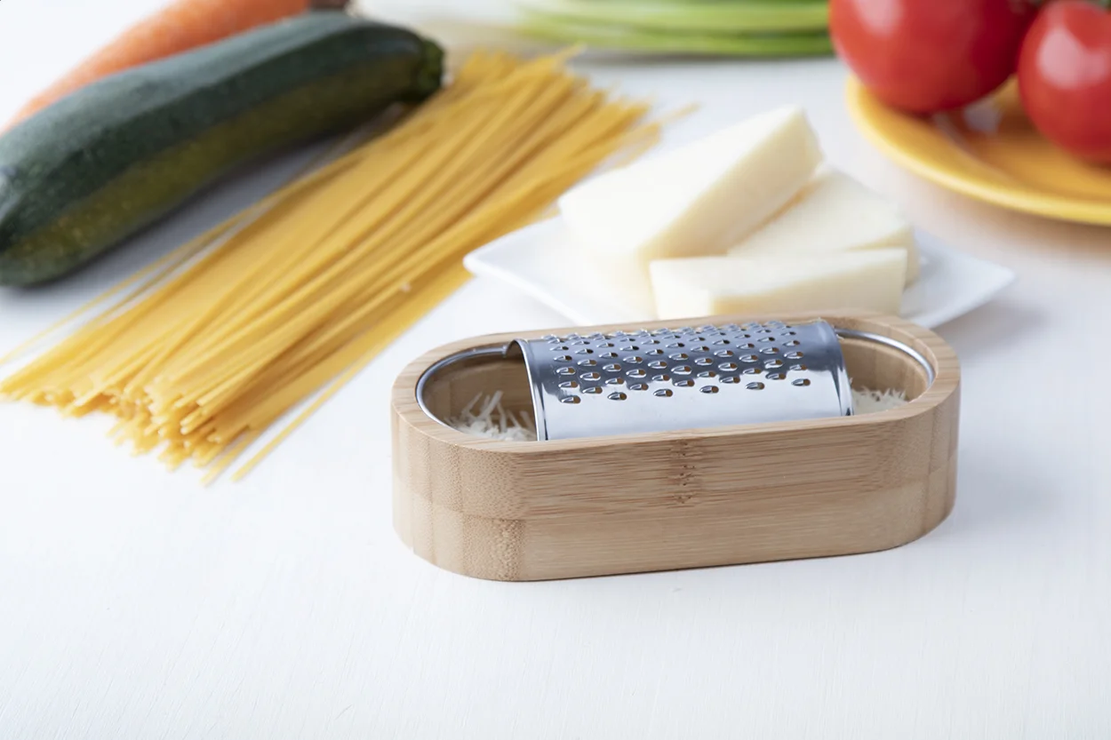 Grattugia formaggio in acciaio inox con vassoio di bambù.