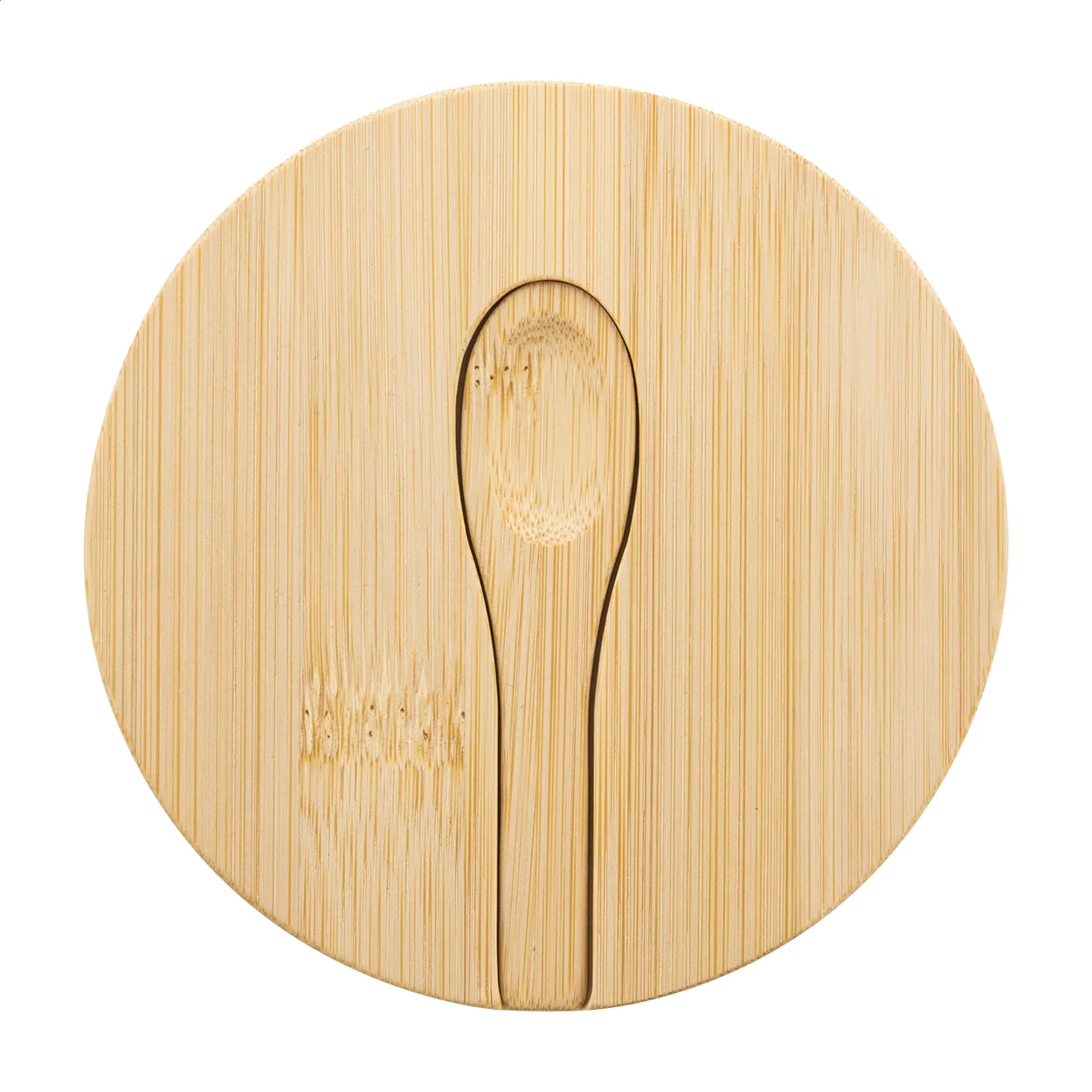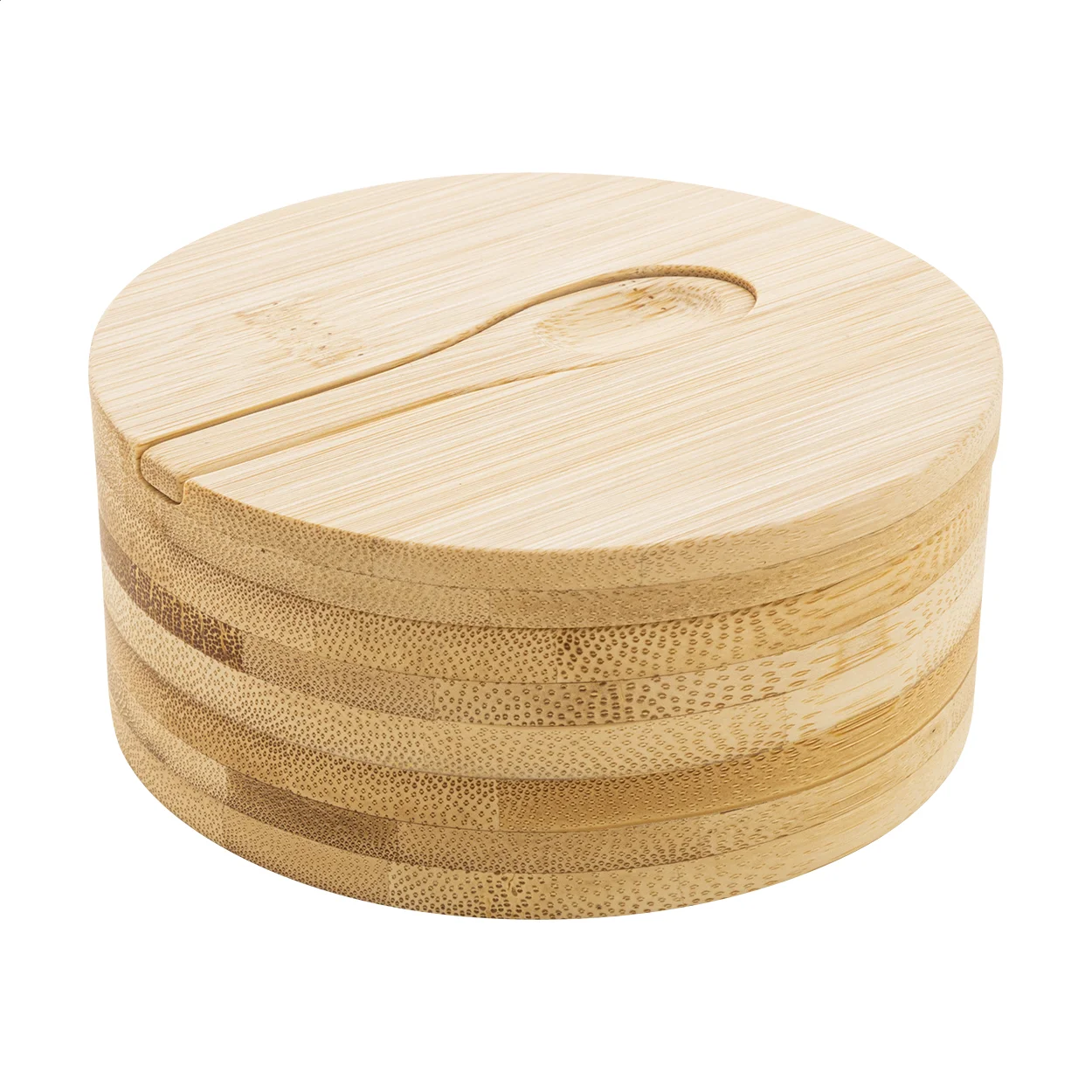 Contenitore porta sale e pepe in bambù con due scomparti e coperchio a rotazione magnetica e cucchiaio di servizio.