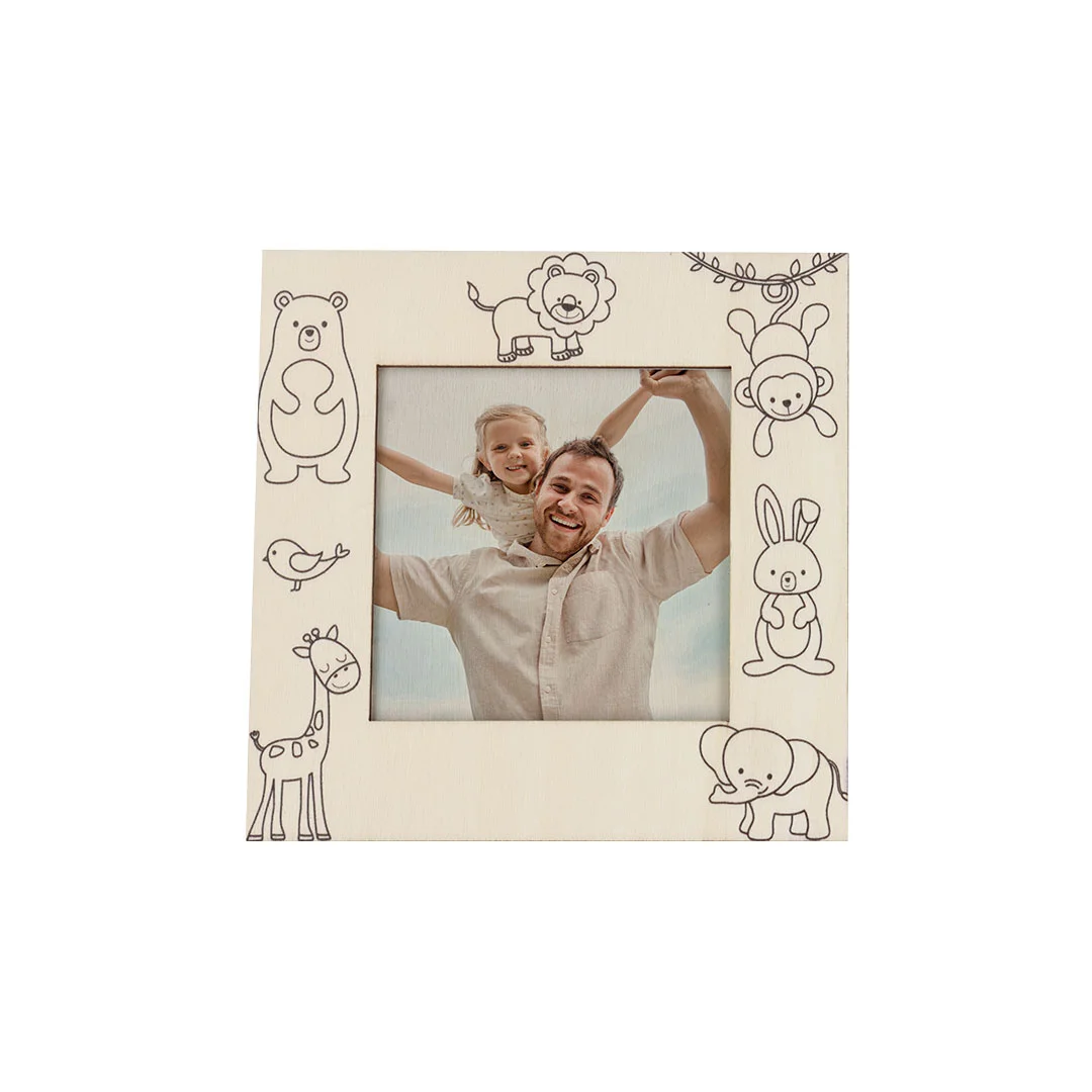 Cornice per foto realizzata in legno naturale con design di animali.