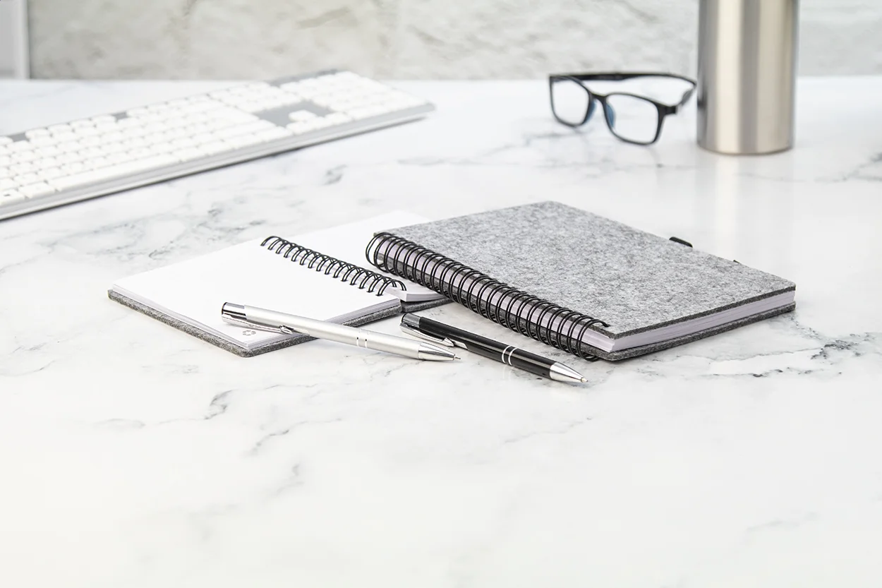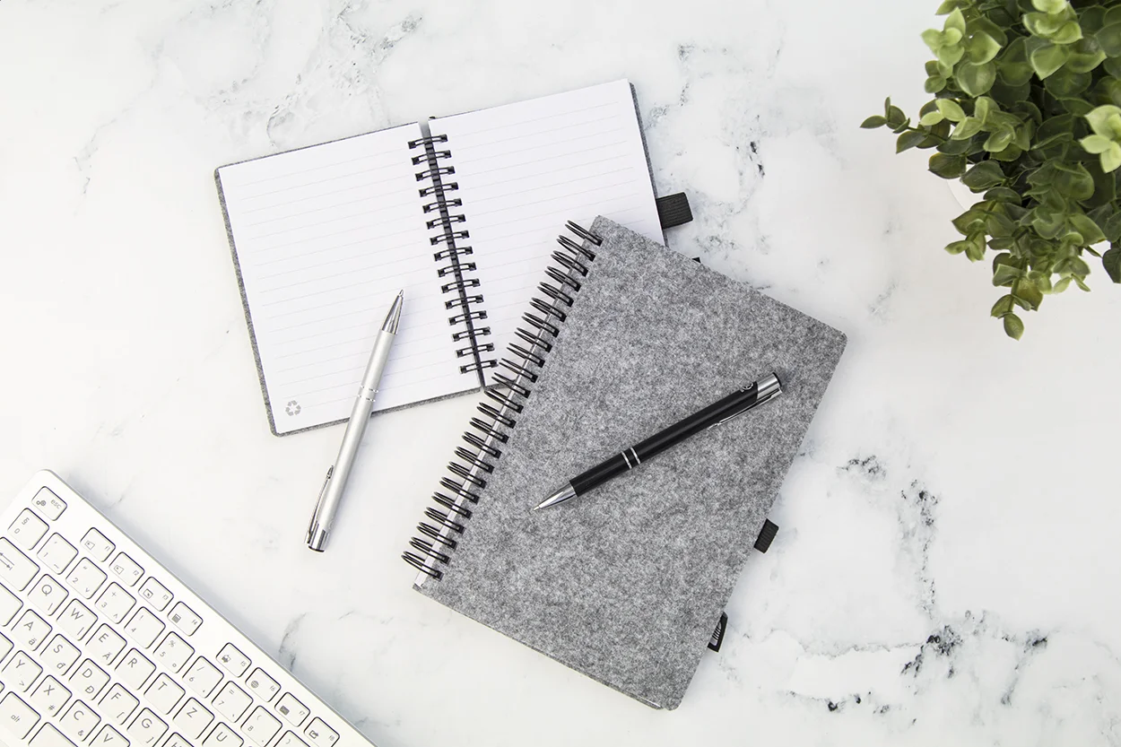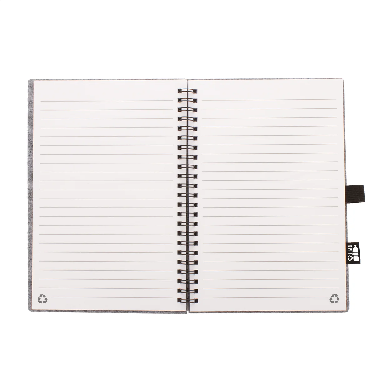 Quaderno a spirale formato A5, con copertina in feltro RPET, fogli a righe in carta riciclata ed etichetta RPET.