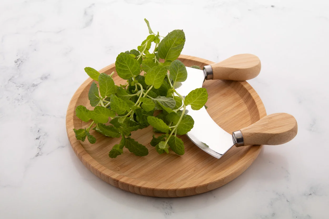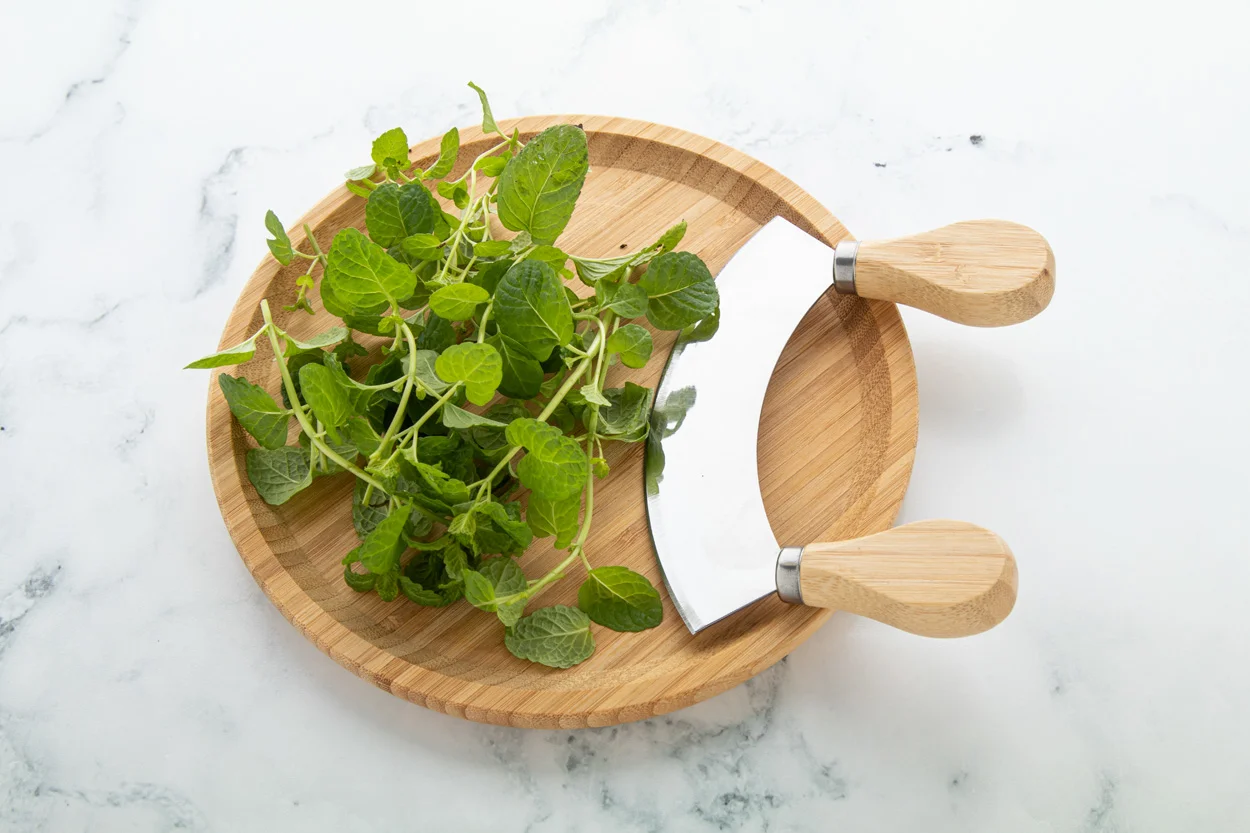 Set da taglio, comprendente un tagliere rotondo in bambù ed una mezzaluna in acciaio inox con manici in bambù.