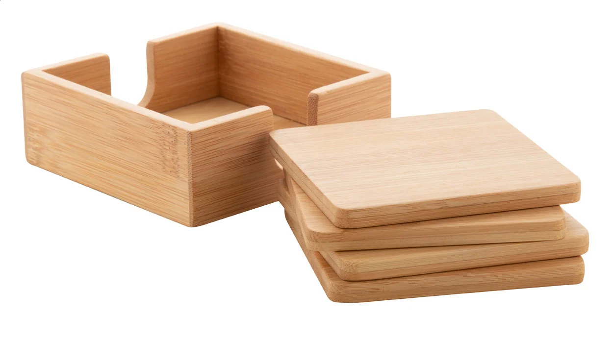 Set 4 sottobicchieri in bambù con porta sottobicchieri.