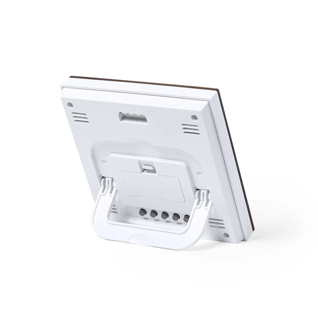 Stazione meteorologica e orologio digitale con pannello frontale in bambù. Funzioni: sveglia, calendario, termometro, igrometro e memoria tendenza temperatura. Funziona con 2 batterie AAA, non fornite.